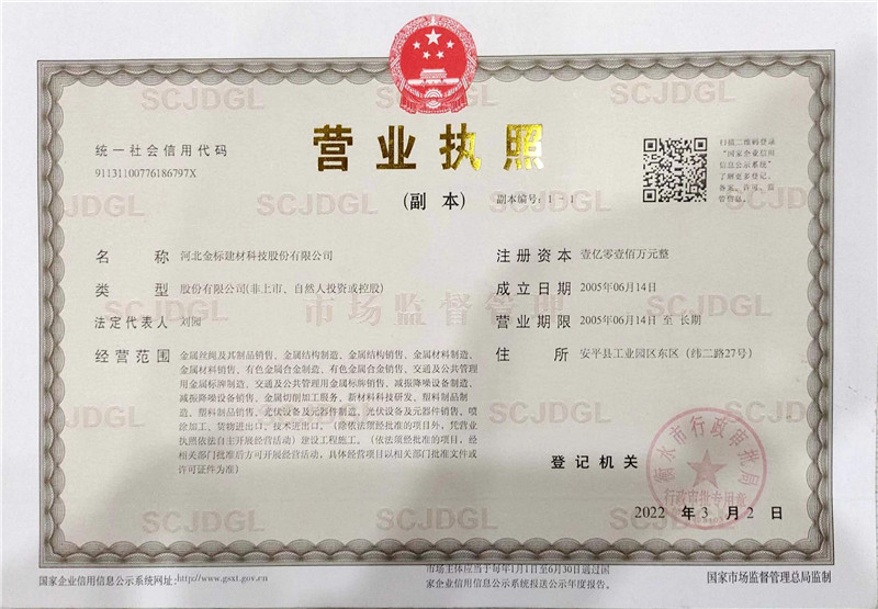 河北金標建材科技股份有限公司成立于2005年,1998年開始建廠生產(chǎn),是一家國內(nèi)較早從事交安材料的專業(yè)生產(chǎn)廠家之一;公司占地200萬畝,擁有員工400余名,注冊資金6040萬, 已通過ISO9001質(zhì)量管理體系認證,具備產(chǎn)品批量生產(chǎn)合格證、多項檢測報告等,先后獲得“AAA級信用企業(yè)”、河北優(yōu)秀企業(yè)”等殊榮。公司業(yè)務(wù)經(jīng)營范圍包括高速公路、鐵路聲屏障生產(chǎn)基地;隔離柵,防護柵欄、刺鐵絲生產(chǎn)基地。